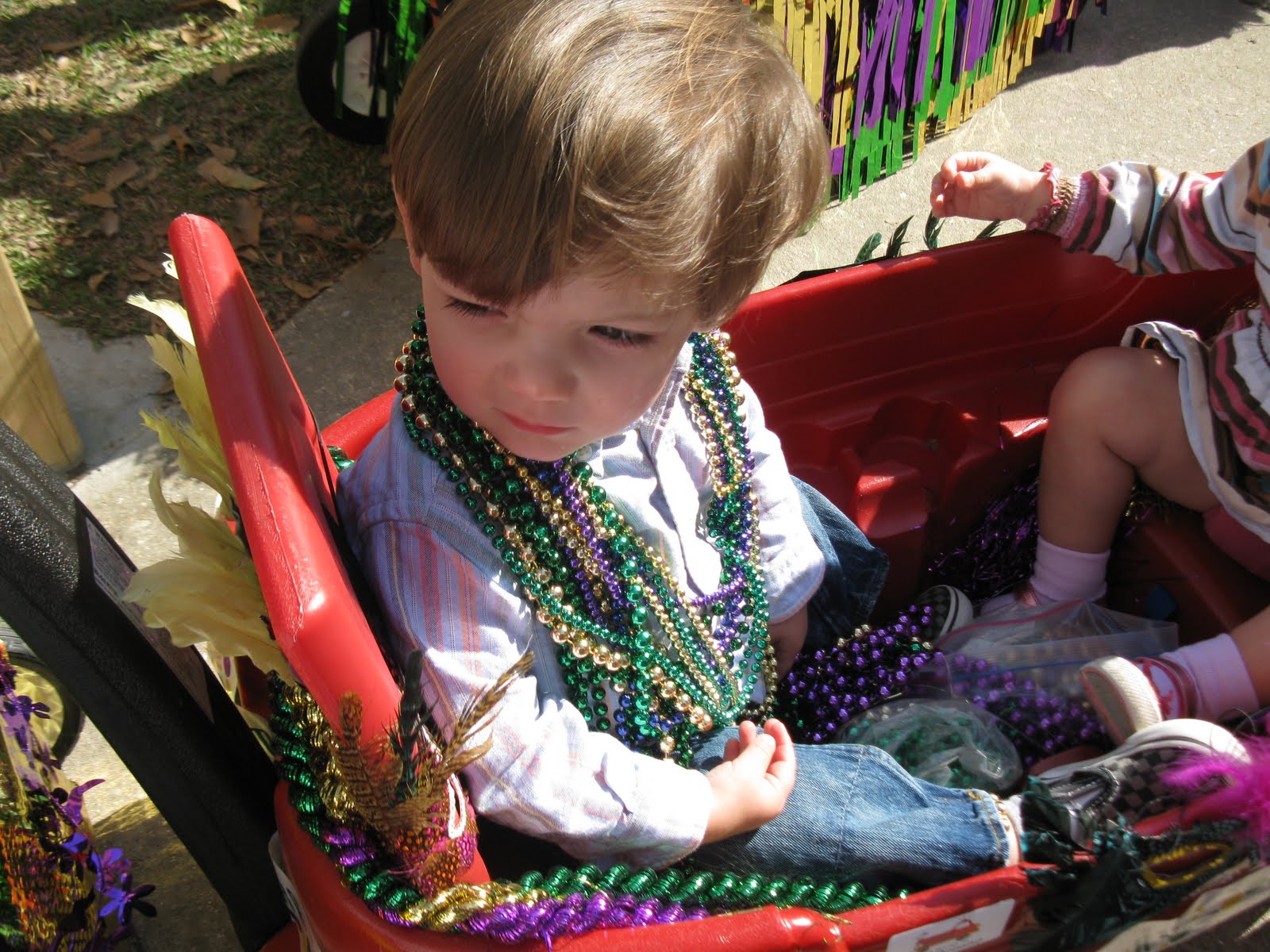 We kicked it off with the Krewe of Tots Parade at St Aloysius. Scott decorated the girls' wagon and they were ready to roll!! Ella Kate was all excited about her Mardi Gras tshirts her class made and was showing hers off proudly! Riley was more about eating the candy than she was throwing! This parade is usually a hit with the girls, but Ella Kate decided it was too loud this year and started bawling crying and we had to take a detour. It is pretty overwhelming, little kids screaming at the top of their lungs"THROW ME SOMETHING!!!!!!!!!!!!!!!!!!!"